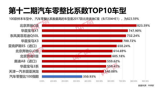 值得關(guān)注的是,本期汽車零整比系數(shù)樣本車型中最高的五款車型分別是北京奔馳C級、華晨寶馬X1、東風英菲尼迪Q50L、華晨寶馬X3和雷克薩斯ES(進口)。其中,北京奔馳C級零整比系數(shù)高達823.59%,也就是說北京奔馳C級所有裝車配件價格加起來超過8輛整車的價格。