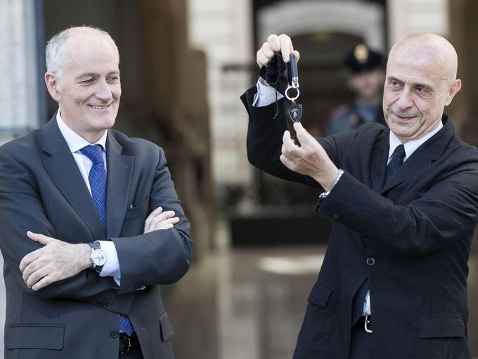 新車(chē)贈(zèng)予儀式上,意大利內(nèi)政部長(zhǎng)馬爾科 明尼蒂向人們展示蘭博基尼Huracán Polizia的鑰匙,旁邊是意大利警察長(zhǎng)弗朗哥(Franco Gabrielli)。(圖五)