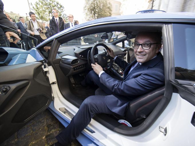3月30日,意大利內(nèi)政部部長(zhǎng)馬爾科 明尼蒂(Marco Minniti)(左)和蘭博基尼的董事長(zhǎng)兼首席執(zhí)行官斯特凡諾 多梅尼卡利(Stefano Domenicali)(左二)出席在羅馬內(nèi)政部舉行的蘭博基尼Huracán Polizia贈(zèng)予儀式。 (圖二)