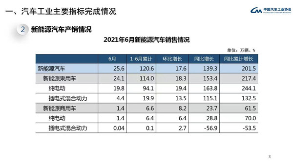 從上半年市場(chǎng)情況來(lái)看,乘用車在芯片短缺、原材料價(jià)格上漲等不利因素影響下,銷量依然超過1000萬(wàn)輛;新能源汽車?yán)塾?jì)銷量已與2019年全年水平持平,其中純電動(dòng)汽車超過100萬(wàn)輛,新能源汽車滲透率也由今年年初的5.4%提高至今年上半年的9.4%,其中6月的滲透率已超過12%,說(shuō)明新興動(dòng)能逐步擴(kuò)大。