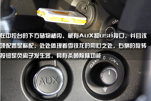 在中控臺的下方儲(chǔ)物槽內(nèi),藏有AUX和USB接口,并且該項(xiàng)配置是標(biāo)配,處處體現(xiàn)著雪鐵龍的用心之處,右側(cè)的旋轉(zhuǎn)按鈕是負(fù)離子發(fā)生器,具有殺菌除味功能,無論是對于大人還是兒童的健康都有很大的好處。