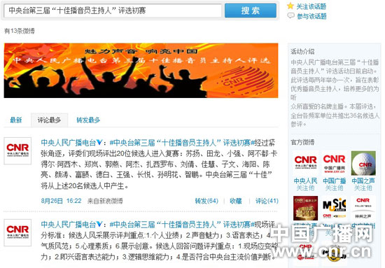 在新浪微博“廣場(chǎng)”區(qū),中央人民廣播電臺(tái)官方賬號(hào)還開設(shè)了“微話題”專頁,匯總?cè)_(tái)各頻率賬號(hào)微博和參賽候選人的微博賬號(hào),具體展示了活動(dòng)賽程、投票方式等信息。網(wǎng)友只要在新浪微博的搜索區(qū)輸入“中央電臺(tái)”、“央廣”、“十佳”等關(guān)鍵字,即可搜索出該專題頁,了解活動(dòng)詳情。