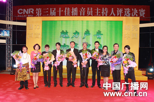 中廣網(wǎng)北京10月28日快訊(記者蔡波 李東巖 何微)中央人民廣播電臺(tái)第三屆十佳播音員主持人評(píng)選10月28日揭曉。中國(guó)之聲蘇揚(yáng)、音樂(lè)之聲田龍、文藝之聲阿杰、維語(yǔ)頻率阿不都卡得爾·阿西木、藏語(yǔ)頻率扎西羅布、中國(guó)之聲鄭嵐、音樂(lè)之聲小強(qiáng)、經(jīng)濟(jì)之聲劉倩、中國(guó)之聲子文、娛樂(lè)廣播海陽(yáng)等十名選手獲得“十佳”桂冠。