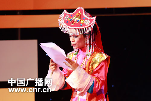 中廣網北京10月28日快訊(記者蔡波 李東巖 何微)中央人民廣播三屆十佳播音員主持人評選決賽于今日(28日)下午13時30分在中央臺音樂廳舉行。20位候選人通過自己的才藝展示爭奪十佳榮譽。藏語廣播主持人德白正在進行才藝展示藏戲 。