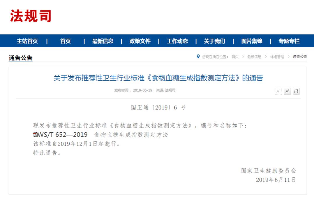 2019年6月11日《食物血糖生成指數(shù)測(cè)定方法(WS/T 652—2019)》行業(yè)標(biāo)準(zhǔn)發(fā)布,將其定義為:進(jìn)食含目標(biāo)量(通常為50 g)可利用碳水化合物的食物后,一段時(shí)間內(nèi)(32 h)血糖應(yīng)答曲線(xiàn)下面積相比空腹時(shí)的增幅除以進(jìn)食含等量可利用碳水化合物的參考食物(葡萄糖)后相應(yīng)的增幅,以百分?jǐn)?shù)表示。