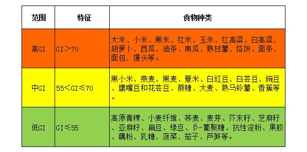 GI值的大小可將富含碳水化合物的食物分為低、中、高三個(gè)類(lèi)別: