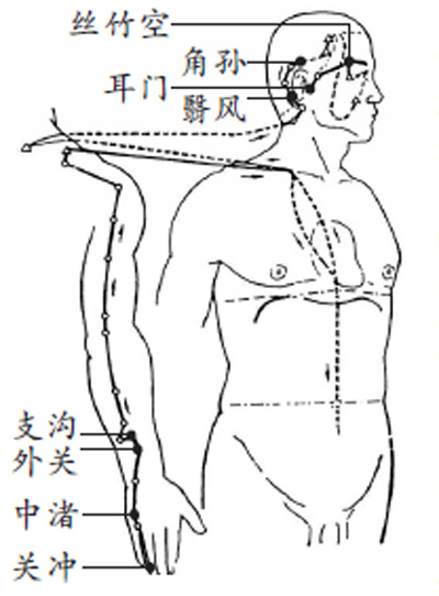 手少陽三焦經好比代理三焦的執(zhí)行官,有溝通臟腑、疏通少陽經脈、調節(jié)水道的作用,治療疾病的范圍很廣。三焦經分布在手臂外側中部、頭的側面和耳朵周圍,起于無名指端的關沖穴,止于眉梢上部的絲竹空 穴(如圖)。