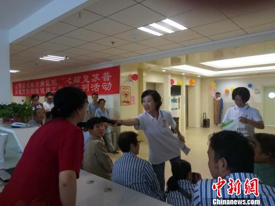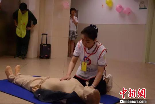 “小丑醫(yī)生”志愿者為患者現(xiàn)場講解心肺復(fù)蘇。 范麗芳 攝