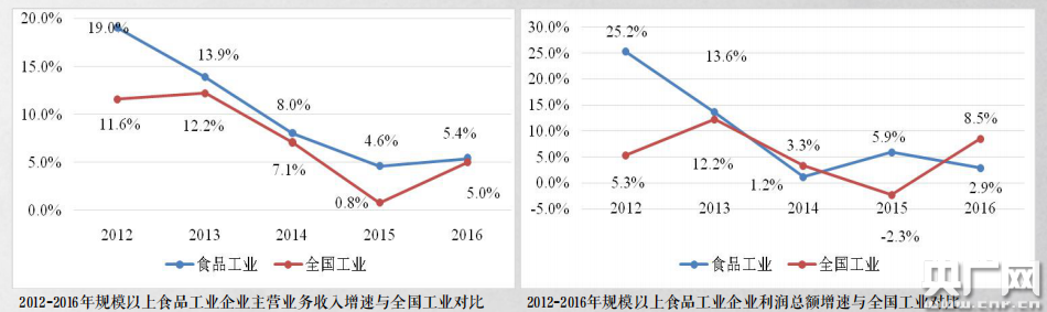同時(shí),食品工業(yè)經(jīng)濟(jì)效益整體保持了平穩(wěn)增長(zhǎng)。2012-2016年,規(guī)模以上食品工業(yè)企業(yè)主營(yíng)業(yè)務(wù)收入增長(zhǎng)速度均高于全國(guó)工業(yè)平均水平。2016年,食品工業(yè)主營(yíng)收入利潤(rùn)率達(dá)到6.9%,高出全國(guó)工業(yè)0.9個(gè)百分點(diǎn);成本費(fèi)用利潤(rùn)率8.5%,高出全國(guó)工業(yè)1.9個(gè)百分點(diǎn)。