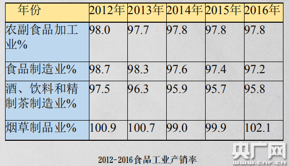 食品工業(yè)產(chǎn)銷銜接一直保持穩(wěn)定態(tài)勢(shì),2016年產(chǎn)銷率為97.7%,2017上半年產(chǎn)銷率為97.6%。