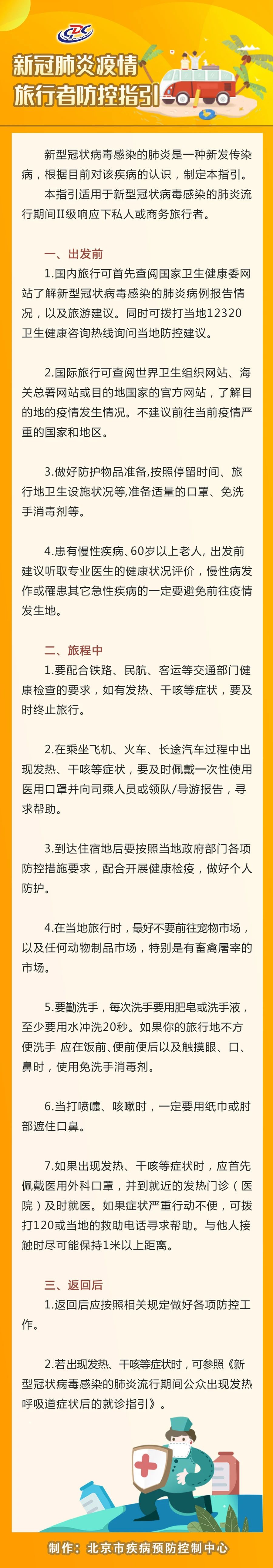 隨著暑期來臨,旅游高峰期即將到來。北京市疾病預(yù)防控制中心副主任龐星火在近日召開的新型冠狀病毒肺炎疫情防控工作新聞發(fā)布會上表示,目前,高考已結(jié)束,暑假開始了,請大家繼續(xù)保持高度警惕,關(guān)注官方發(fā)布的疫情信息,了解疫情發(fā)展形勢,避免前往境內(nèi)外高風(fēng)險(xiǎn)國家和地區(qū)。如果計(jì)劃外出游玩,要關(guān)注目的地的疫情狀況和防控要求,做好充分的口罩、消毒紙巾、手部消毒劑、驅(qū)蚊劑等防疫物品準(zhǔn)備,自覺遵守目的地、公共交通、景區(qū)等防疫規(guī)定,避免接觸野生動物;建議選擇衛(wèi)生條件好的正規(guī)餐廳就餐;全程做好防護(hù)和健康監(jiān)測,如有不適,及時(shí)到當(dāng)?shù)卣?guī)醫(yī)療機(jī)構(gòu)就診并主動報(bào)告行程和接觸的環(huán)境及人員情況。目前雖然北京市疫情防控形勢持續(xù)向好,但是境外疫情仍處于高發(fā)狀況,建議市民近期不宜出國旅行或旅游。