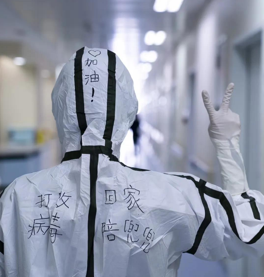 王巖的防護(hù)服上寫著“加油!打敗病毒回家陪兜兜”(受訪者供圖 央廣網(wǎng)發(fā))
