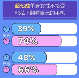 《報告》顯示:超過七成的單身女性不接受戀人翻看她的手機內(nèi)容。在婚姻生活中,哪怕夫妻之間需要彼此間的信任,但也需要保留屬于自己的個人空間。因此,66%的已婚女性不愿意對方翻看自己的手機。