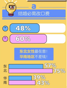兩個人的婚姻,不僅涉及到不同觀念的碰撞與磨合,更要考慮到雙方家庭經(jīng)濟實力的綜合對比。所以,彩禮、改口費、房子似乎一度成為了衡量婚戀質(zhì)量的重要標尺,這無疑考驗著個人、家庭的經(jīng)濟實力!秷蟾妗凤@示:60%的女性和48%的男性認為“結(jié)婚需要改口費”;按地域區(qū)分,東北女性最為在意,比例高達75%,而華南地區(qū)比例最低,僅有43%的女性堅持需要改口費。