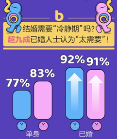 戀愛只需要雙方開心即可,但婚姻需要更多的磨合,這也使得人們對待婚姻更加謹慎。隨著“離婚冷靜期”引起熱議,也一度引發(fā)了人們對結(jié)婚也需要冷靜期的討論。《報告》顯示:77%的單身男性與83%的單身女性認為“結(jié)婚需要冷靜期”。這個觀點,在已婚人群中被強烈認同,超過了九成的已婚人士認為“結(jié)婚冷靜期”很有必要。