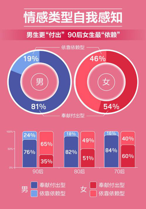 在一段感情里,其中一方過多的付出,卻得不到理解和回報(bào),即便是再堅(jiān)固的愛情,也抵擋不住時(shí)間的磨練。時(shí)間永遠(yuǎn)是一座磨練場,它能讓人變得更加的成熟,以及理性。正如報(bào)告所示,從受調(diào)人群反饋的數(shù)據(jù)可以看出,女性隨著年齡的增長,認(rèn)為自己是“依賴性”的比例快速下降。