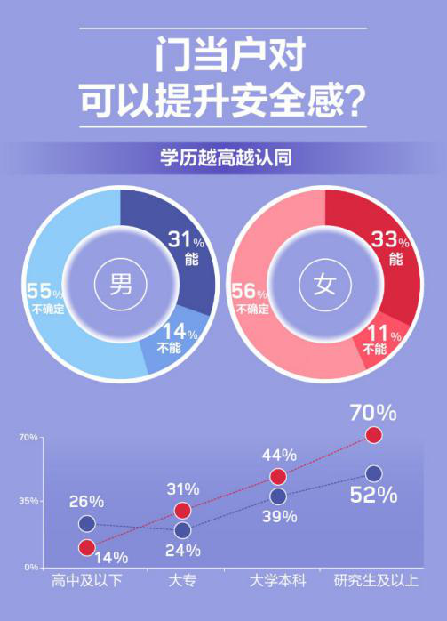 《報(bào)告》顯示,86%的男性和97%的女性都認(rèn)為婚戀中安全感十分重要。而“門當(dāng)戶對”被不少人認(rèn)為能夠帶來安全感。其中,隨著學(xué)歷的增長,人們對門當(dāng)戶對則更加看重,認(rèn)可門當(dāng)戶對能帶來安全感的占比也不斷升高。特別是研究生及以上學(xué)歷的單身人群中,七成的單身女性和過半數(shù)的單身男性均持贊同的態(tài)度。