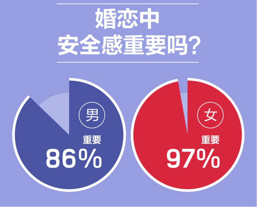 一直以來(lái),安全感是親密關(guān)系中不變的話題,且存在性別差異。《報(bào)告》統(tǒng)計(jì):86%的男性和97%的女性都認(rèn)為婚戀中安全感重要,其中近八成女性認(rèn)為安全感非常重要。