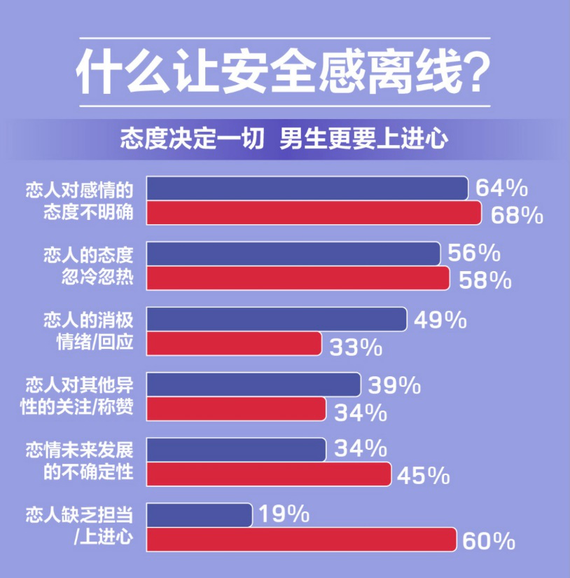 安全感在親密關(guān)系中的重要性不可言說(shuō),別讓安全感離線是男女必須學(xué)會(huì)的能力,態(tài)度決定一切!秷(bào)告》表明:64%的男性和68%的女性認(rèn)為“戀人對(duì)感情的態(tài)度不明確”,以及56%的男性和58%的女性認(rèn)為“戀人的態(tài)度忽冷忽熱”這兩項(xiàng)占比最高。