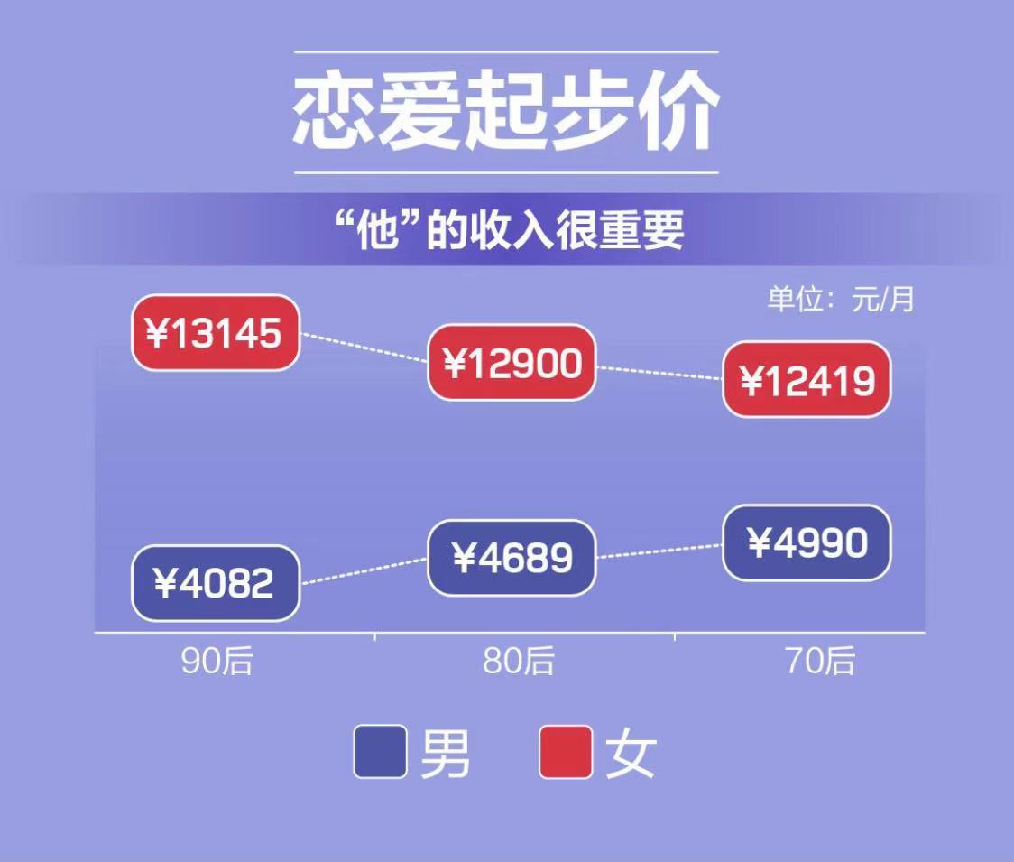 近年來(lái),女性心中的戀愛(ài)起步價(jià)連續(xù)上升,男性則呈現(xiàn)波動(dòng)上升趨勢(shì)!秷(bào)告》顯示:90后女性和70后男性對(duì)理想戀人的最低收入要求最高,分別為13145元/月和4990元/月。