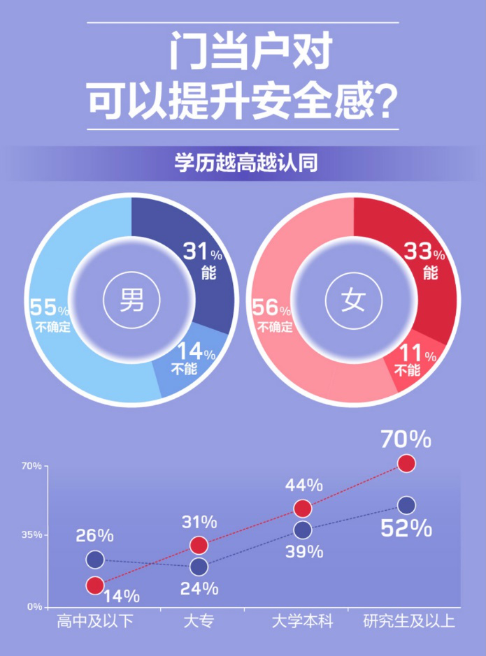 陳曦說(shuō)的不無(wú)道理,根據(jù)《報(bào)告》的統(tǒng)計(jì):隨學(xué)歷升高,認(rèn)可門當(dāng)戶對(duì)能帶來(lái)安全感的占比也升高,特別是研究生及以上學(xué)歷的女性,七成表示認(rèn)同。