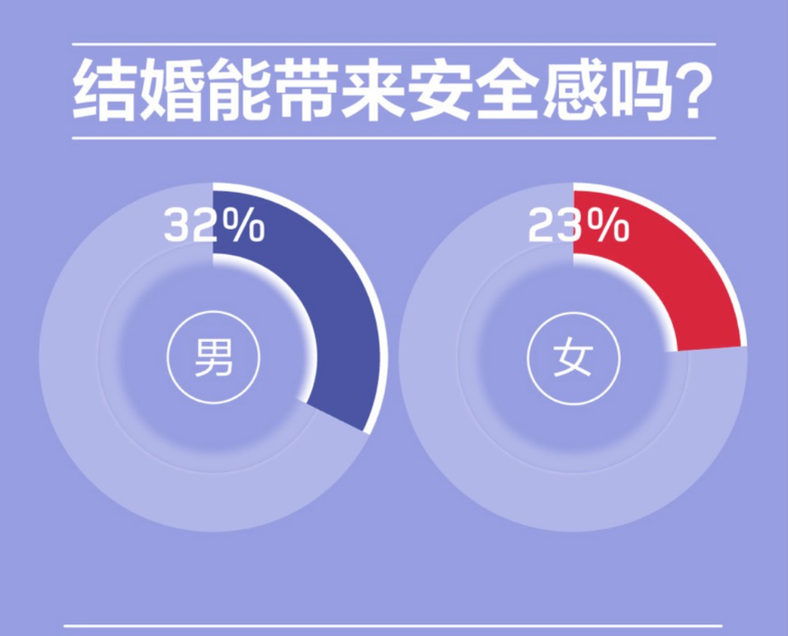 而結(jié)婚也不再像過(guò)去傳統(tǒng)觀念所言,一紙婚書雙方便能得到終身保障。隨著近年來(lái)離婚率的提高,男女逐漸對(duì)結(jié)婚能否帶來(lái)安全感這一問(wèn)題有了重新的思考!秷(bào)告》顯示:32%的男性和23%的女性認(rèn)為結(jié)婚能帶來(lái)安全感,同時(shí)有42%的男女一致認(rèn)為財(cái)產(chǎn)公證對(duì)提高安全感有幫助。