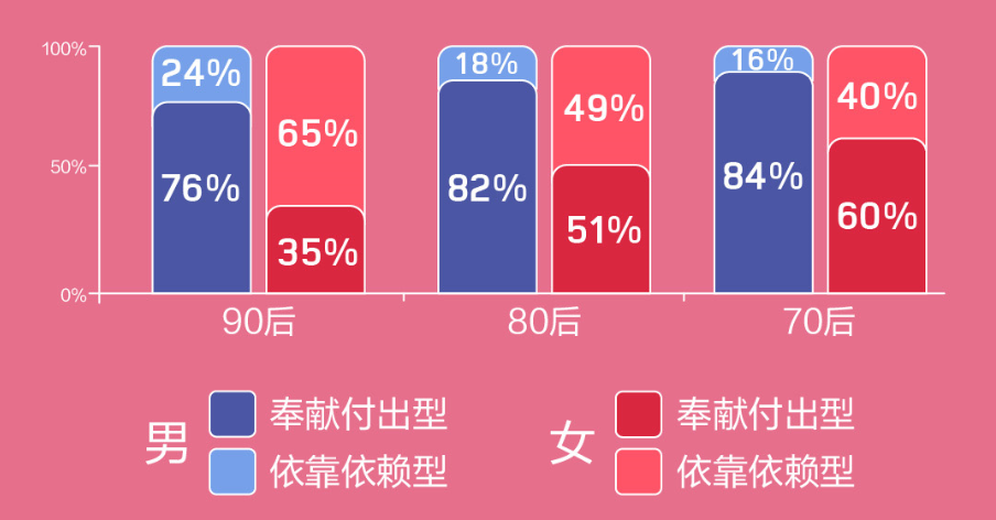 有人說最好的愛情就是兩人相互依賴著愛在一起,但在現(xiàn)實中我們發(fā)現(xiàn),許多人是依賴型,希望更多被照料,也有許多人是奉獻型,愿意為最愛的人付出。此次《報告》也對于這個情況進行了深入調(diào)研,結(jié)果顯示單身男性中絕大多數(shù)男性在感情關系中,希望另一半可以依靠自己。調(diào)查數(shù)據(jù)顯示:八成人認為自己在戀愛中屬于奉獻付出型,僅有兩成人認為自己是依靠依賴型;而單身女的自我感知則與男性存在顯著差異,自認為奉獻付出型和依靠依賴型的比例相近,差距不到10%,更多女性希望自己是被呵護被愛的那一個。