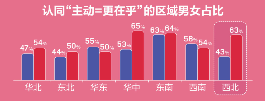 從地域數(shù)據(jù)上看,不同地域?qū)τ凇爸鲃?更在乎”的認可程度也存在明顯差異,西北地區(qū)單身男女認可的差異最大,有63%的女性認為主動代表更在乎對方,而只有43%男性認可。