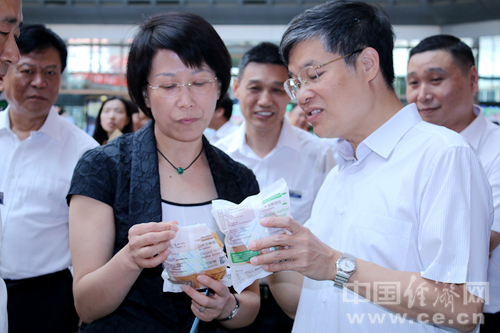 中國鐵路總公司黨組成員、副總經理李文新(右)向國家食品藥品監(jiān)督管理總局新聞宣傳司司長顏江瑛(左)介紹新推出的鐵路配餐食品。中國經濟網記者 韓肖/攝