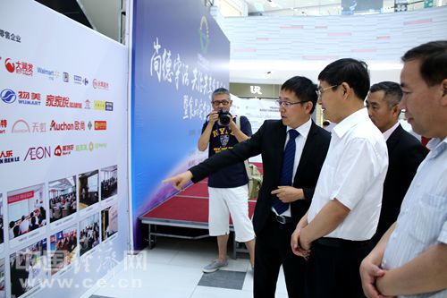 國(guó)家食品藥品監(jiān)督管理總局黨組成員、食品安全總監(jiān)郭文奇(左一)、中國(guó)連鎖協(xié)會(huì)秘書(shū)長(zhǎng)裴亮(左二)與永旺超市相關(guān)負(fù)責(zé)人共同開(kāi)啟2016年“食品安全宣傳周超市行”。中國(guó)經(jīng)濟(jì)網(wǎng)記者 韓肖/攝