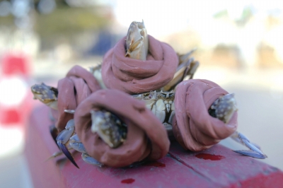 被纏滿橡皮圈出售的螃蟹。