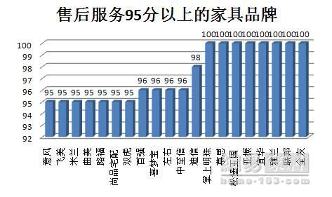2012年得分在95分以上的企業(yè)有12家,而2013年調(diào)查的70家企業(yè)中,得分在95分以上的企業(yè)有20家,其中全友、聯(lián)邦、雅蘭、宜華、亞振、松堡王國(guó)、慕思、掌上明珠等7家企業(yè)獲得了100分的成績(jī)。而2012年家具行業(yè)取得滿分的企業(yè)僅慕思、皇朝、美克美家3家。今年得滿分的企業(yè)中有不少企業(yè)成績(jī)有大幅度的躍升,比如全友在2012年的調(diào)查中得分為68分,2013年的調(diào)查中獲得100分。全友作為全國(guó)知名的大品牌,在實(shí)力和品牌知名度不斷提升的同時(shí),服務(wù)水平也取得了長(zhǎng)足的進(jìn)步。