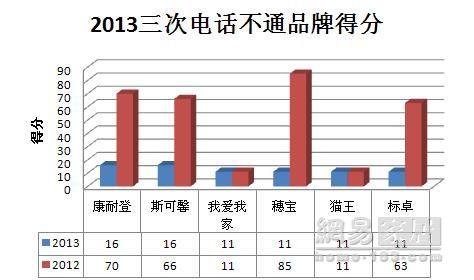 其中,貓王和我愛(ài)我家在2012年的調(diào)查中也是電話無(wú)人接聽(tīng)或者無(wú)法接通。而去年得分85分的穗寶,今年的調(diào)查中售后電話竟然三次都無(wú)人接聽(tīng),這與去年基本都能接通的情況大相徑庭。