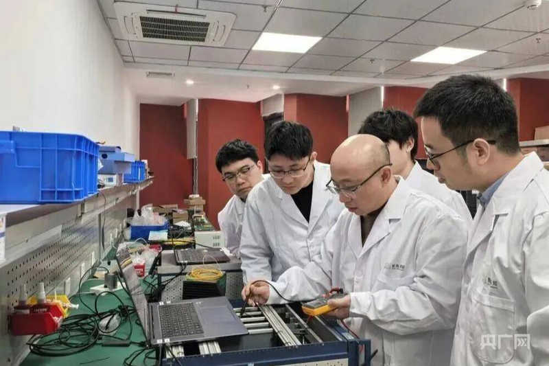 智地感知?jiǎng)?chuàng)始人張強(qiáng)(右二)帶領(lǐng)團(tuán)隊(duì)調(diào)試設(shè)備(央廣網(wǎng)發(fā) 蜀山區(qū)委宣傳部供圖)