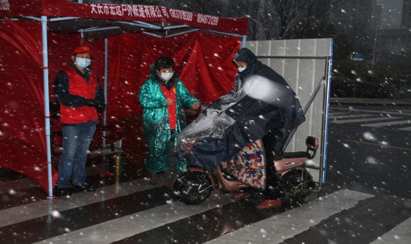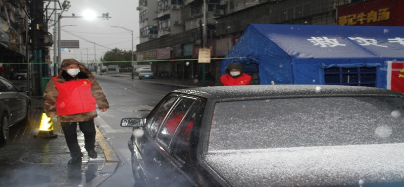 “昨天風大,先是雨,后是雪。我們設在一個小區(qū)卡口的帳篷一連倒了兩次。沒辦法,最后我們索性開來一輛面包車,車廂就是臨時檢查站,拉上一根繩就算是欄桿。再困難,任務也要完成,陣地不能丟。”想到15號一整天,自己的十多位同事風雪中堅守崗位的經歷,天長市人民檢察院辦公室副主任段彥菁依然十分感動。“天很冷,但是我們的心里是熱乎乎的?吹街驹刚叱燥埡人欣щy,有個小區(qū)居民帶著驅寒用的紅棗湯和茶葉蛋、方便面,下樓送到我們手中。丟下東西就走,直到現在,我們都不知道他的姓名。”