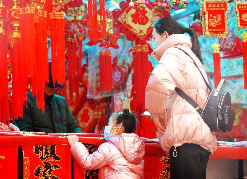 各個(gè)攤位前,有跟著媽媽一起來(lái)買春聯(lián)的小朋友,也有挑選新年裝飾的老人家,年的幸福與渴望,就在這裝扮新年的儀式感里慢慢熱絡(luò)起來(lái)。