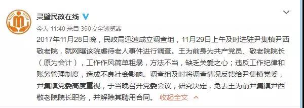 11月30日上午,靈璧縣民政局官方微博“靈璧民政在線”發(fā)布了通報稱:“2017年11月28日晚,民政局迅速成立調查組,11月29日上午及時進駐尹集鎮(zhèn)尹西敬老院,就網(wǎng)曝該院虐待老人事件進行調查。王為前身為共產黨員、敬老院院長(原為會計),工作作風簡單粗暴,方法不當,缺乏關愛之心;違反工作紀律和賬務管理制度,造成不良社會影響。調查組及時將調查情況反饋給尹集鎮(zhèn)黨委,尹集鎮(zhèn)黨委高度重視,于當晚召開黨委會議,研究決定,免去王為前尹集鎮(zhèn)尹西敬老院院長職務,并解除其聘用合同!