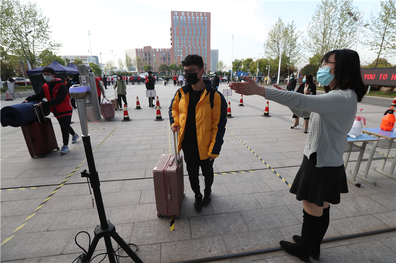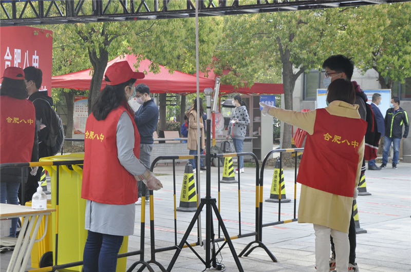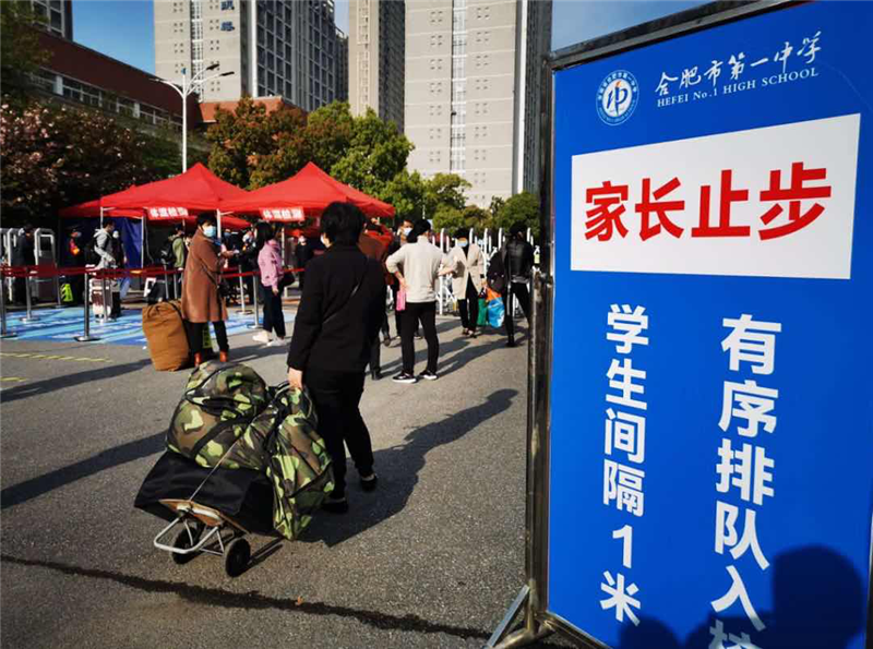 4月7日是高三年級返校首日, 在合肥一中教學(xué)區(qū)的西大門設(shè)置了六條學(xué)生返校通道。為避免人群聚集,還設(shè)置了家長等候區(qū),家長不可以入校。學(xué)生在進入班級之前也要由班主任進行體溫檢測正常后進入班級。