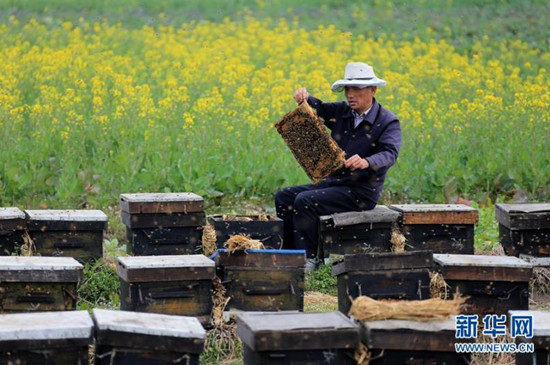 春回大地,萬物復(fù)蘇,安徽省黃山市各地的油菜花依次盛開,徽州傳統(tǒng)的養(yǎng)蜂人開始追花放蜂采蜜,在金燦燦的油菜花叢中干起自己的“甜蜜事業(yè)”。新華社發(fā)(施廣德 攝)