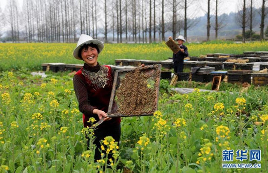 2月20日,安徽省黃山市萬安鎮(zhèn)蜂農(nóng)在油菜花田里放蜂割蜜。