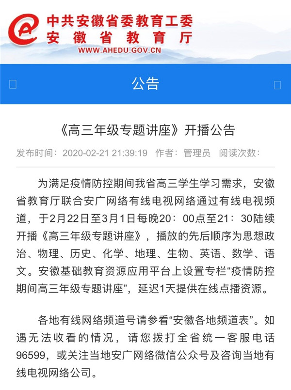 2月22日,安徽省教育廳發(fā)布3月2號(hào)起大中小學(xué)全面啟動(dòng)線上教育的通知:學(xué)生未返校期間,自2020年3月2日起,全省高校、中職學(xué)校、中小學(xué)校將通過電視、網(wǎng)絡(luò)等方式,開展線上教育教學(xué)。