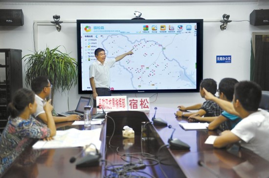 7月3日晚,宿松縣防汛抗旱指揮部成員在分析實(shí)時(shí)水情。 7月2日,長(zhǎng)江安徽段第一個(gè)水位站宿松縣匯口水位站水位超警戒,該縣啟動(dòng)防汛應(yīng)急預(yù)案,目前已緊急轉(zhuǎn)移安置169戶288人。徐旻昊 孫凱華 攝