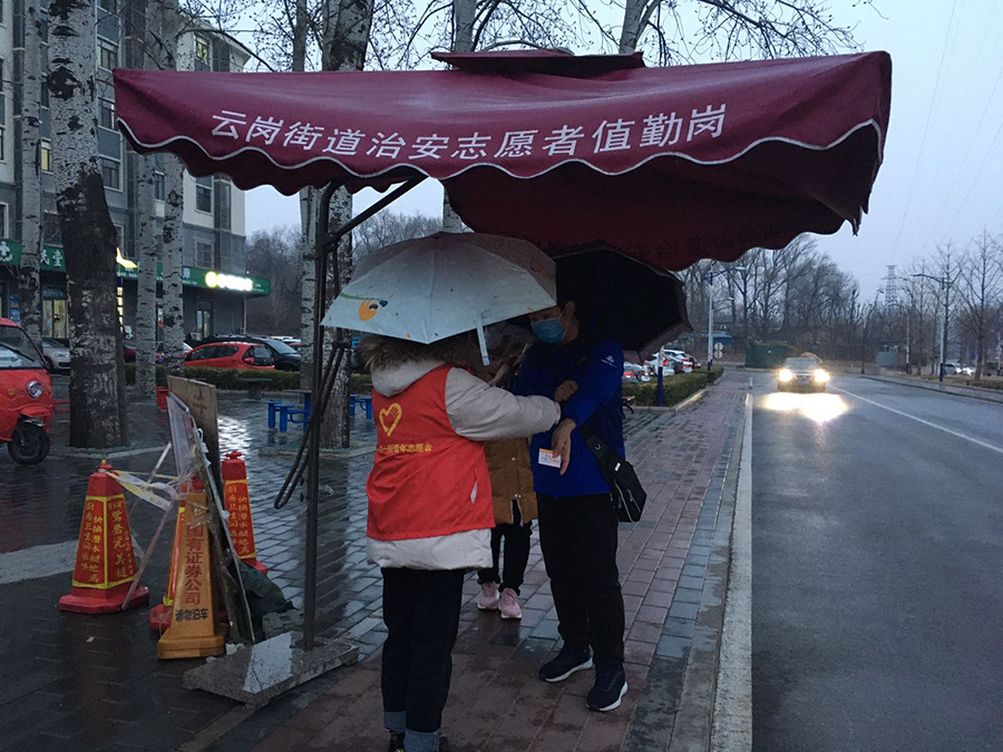 “晚上下班,在小區(qū)出入口看到了自己的街坊鄰居,也有同事,覺得很親切!”居住在云崗的居民說。地區(qū)單位職工一手抓復(fù)工復(fù)產(chǎn)、一手抓疫情防控,結(jié)束一天工作的他們,在夜幕降臨時走上社區(qū)疫情防控一線的“新崗位”,履行新職責(zé)。目前,云崗街道轄區(qū)共有防控卡口69個,基本分布在地區(qū)單位職工小區(qū)。街道將各社區(qū)卡口具體位置進(jìn)行梳理,制作“疫情防控值守點位圖”,各地區(qū)單位結(jié)合樓院產(chǎn)權(quán)情況主動認(rèn)領(lǐng)40個卡口,組織本單位就近居住的職工志愿者分組排班,于每天晚上6點至9點下班高峰時段頂崗值守。每晚上崗前,由包片社區(qū)干部對職工志愿者進(jìn)行崗前培訓(xùn),并發(fā)放口罩、手套等防護(hù)物資。職工志愿者們在下班高峰時段來臨前準(zhǔn)時出現(xiàn)在小區(qū)出入口,接過手套、額溫槍,戴好口罩、紅袖標(biāo),進(jìn)行出入證查詢、體溫測量、來訪登記等工作,有時甚至來不及吃晚飯就匆匆忙活起來,扛起人流、車流量最為密集時段的重任,默默守護(hù)單位屬地和社區(qū)家園。晚9點職工志愿者值守結(jié)束后,小區(qū)物業(yè)保安人員持續(xù)在崗,確保夜間防控不留空白。