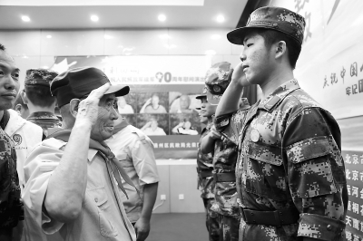 抗戰(zhàn)老兵為武警戰(zhàn)士佩戴胸徽。