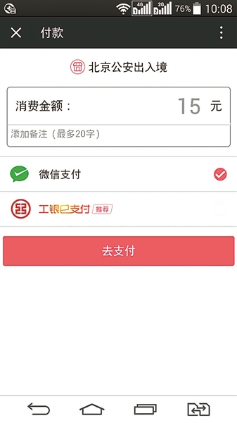 當(dāng)前,通過(guò)掃描二維碼完成付費(fèi)已經(jīng)成為市民重要的支付方式之一。昨天,北京青年報(bào)記者從北京市公安局了解到,為契合市民生活方式,從今天起,辦理出入境業(yè)務(wù)可用微信進(jìn)行支付,同時(shí)自助受理一體機(jī)上也推出了此項(xiàng)功能。經(jīng)測(cè)試,在網(wǎng)絡(luò)良好的情況下,申請(qǐng)人10秒鐘即可完成出入境證件費(fèi)用的繳納。