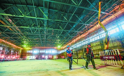 ▲昨天,首鋼精煤車間內(nèi)的冰壺訓練館改建工程現(xiàn)場,工人在搬運建材。