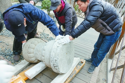 昨天,市總工會將機(jī)關(guān)院內(nèi)發(fā)現(xiàn)的清代露陳墩等8件石刻文物捐贈給圓明園收藏。記者 吳鏑攝
