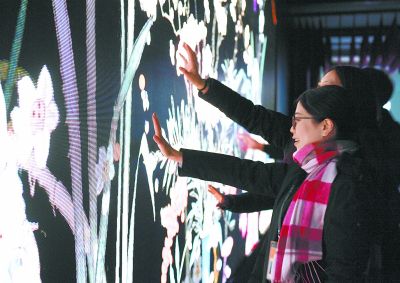 “宮里過(guò)大年”數(shù)字沉浸體驗(yàn)展將于22日在乾清宮東廡開幕,圖中展示的是“花開歲朝”部分,揮動(dòng)手臂,蝴蝶飛舞,花枝搖曳。新華社記者金良快 攝