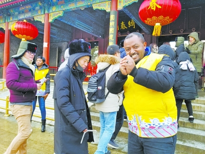 昨天下午3點,記者趕到圓明園南門時,只見10個身穿黃色馬甲的身影在人群中格外醒目!澳茫堊哌@里”、“新春快樂!”……常樂和幾位留學生小伙伴站在南門入口處,熟練地伸出右手做出“請”的動作,隨即向游客拱手作揖表示歡迎。對于使用電子票的游客,常樂和同伴們要幫助他們掃碼,以確保所有游客都能及時入園游覽,同時還要為過往游客指路,幫助外國游客翻譯溝通。在常樂一行人的幫助下,一批又一批的游客有序進入園內(nèi),不少人對他們豎起大拇指!巴瑢W們真棒!”常樂告訴記者,大家從正月初一開始,每天9點準時到崗,一直到下午4點,為游客志愿服務近7小時。他說,自己的家鄉(xiāng)從沒有過這么冷的時候,所以還是有點不適應北京的冬天!霸趹敉庾鲋驹腹ぷ餍枰朔├щy,多穿些衣服!