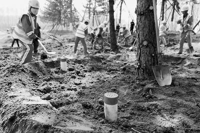 不止是“呼吸”管道,這片綠地施工現(xiàn)場(chǎng)還有不少有意思的細(xì)節(jié):平常種樹,都會(huì)在填好的樹坑外頭做一個(gè)圍堰,方便澆水;可在這里的“千年守望林”,從拆遷村移植來的大樹,統(tǒng)統(tǒng)都是雙層圍堰,即以樹苗為中心,組成同心圓或者回字形,兩個(gè)圍堰分別澆水,為根系補(bǔ)給充足的水分。